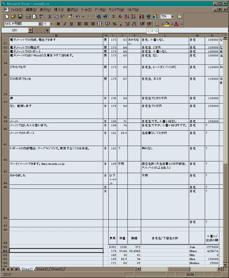 つまり、前項で作成したデータを SAS で解析するには、 stat システムに持って行く(転送という)必要がある。 なお、stat システムにはプリンタが接続されていないので、 出力に関しても UNIX から Windows に転送する必要があるが、 この実習は後日行う。